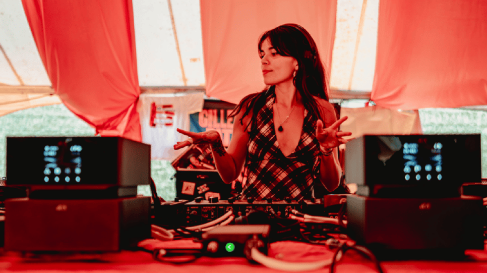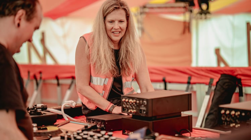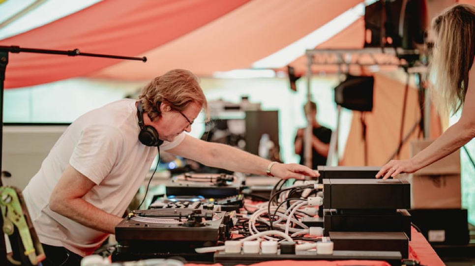 このサウンドシステムは、デジタルとアナログの両方を再生します。グラスゴーの小売店Loud & ClearおよびオーディオメーカーのA-Live Soundとの共同企画により、dCS Lina DACとマスタークロックに加え、ロータリー式Isonoeまたはリニア式Mastersoundsアナログミキサー、 パイオニアCDJ 2000NXS2プレーヤー、テクニクス1200GR2ターンテーブル、オーディオテクニカ製MM型ハイファイカートリッジ、Simaudio製Moonフォノプリアンプなどを組み合わせ、大々的に使用しています。ケーブル類と電源処理装置はThe Chord Company製、スピーカーはDanley Sound Labs製を採用しています。さらに、ルパート・ニーヴ、ソリッド・ステート・ロジック(SSL)、dbx、クラーク・テクニックのスタジオグレード機器を備えたマスタリング用機器がこれを支えています。このような大きな会場でのダンスフェスには珍しい、音響重視のコンセプトです。フェスティバルでこのレベルのオーディオファイル向け・スタジオグレード機器を見かけることは、前代未聞とは言わないまでも極めて稀です。しかしこの構成により、コリーンとアダムは素晴らしい音楽体験を来場者にプレゼントでき、特に、野外イベントで音楽を聴く際にしばしば体験するような、ブーミーな低音や歪みのない素敵な音楽で空間を満たしています。このシステムは、フェスティバル会場特有の音響的課題を考えて慎重に組み合わされていて、フェスに来る人達全員に最高の音質で音楽を愉しんでもらうことが出来るように、細かい点まで配慮したシステムになっています。
