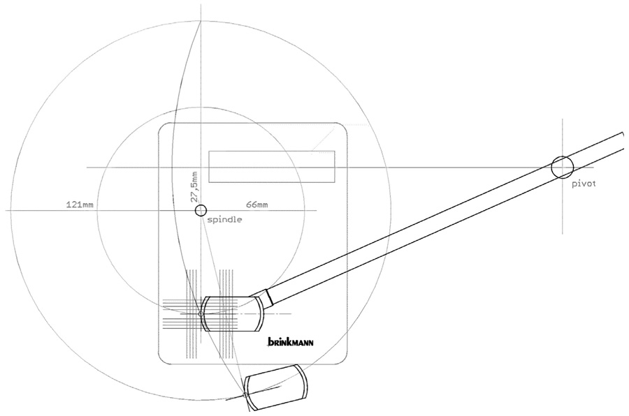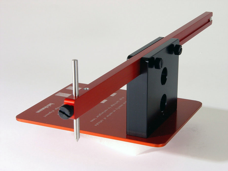 With this protractor there is no interpolation necessary, which makes it fast to precisely align the cartridges and tonearms. With interpolations and even more by finding the pivot by simply looking along a line on the protractor, there occur too many deviations, at least added by inprecise printings of the simple protractors. A stylus contacting the record with only a few thousands of a millimetre needs an extraordinary precise aligning. Sometimes the correct alignment can be limited by the mounting slots in the headshell of the tonearm. In this case the tonearm has to be moved to a different distance between spindle and pivot. It has to be moved so that the correct alignment of the cartridge can be achieved given the size of the headshell slots. Usually this is only possible by eccentrically drilled tonearm bases that can be turned. Or the arm itself has a slide which makes the arm able to be moved. At least this will alter the effective length of the tonearm, maybe different from the given length mentioned in the datasheet of the arm. This is OK as long as the cartridge is aligned properly.
