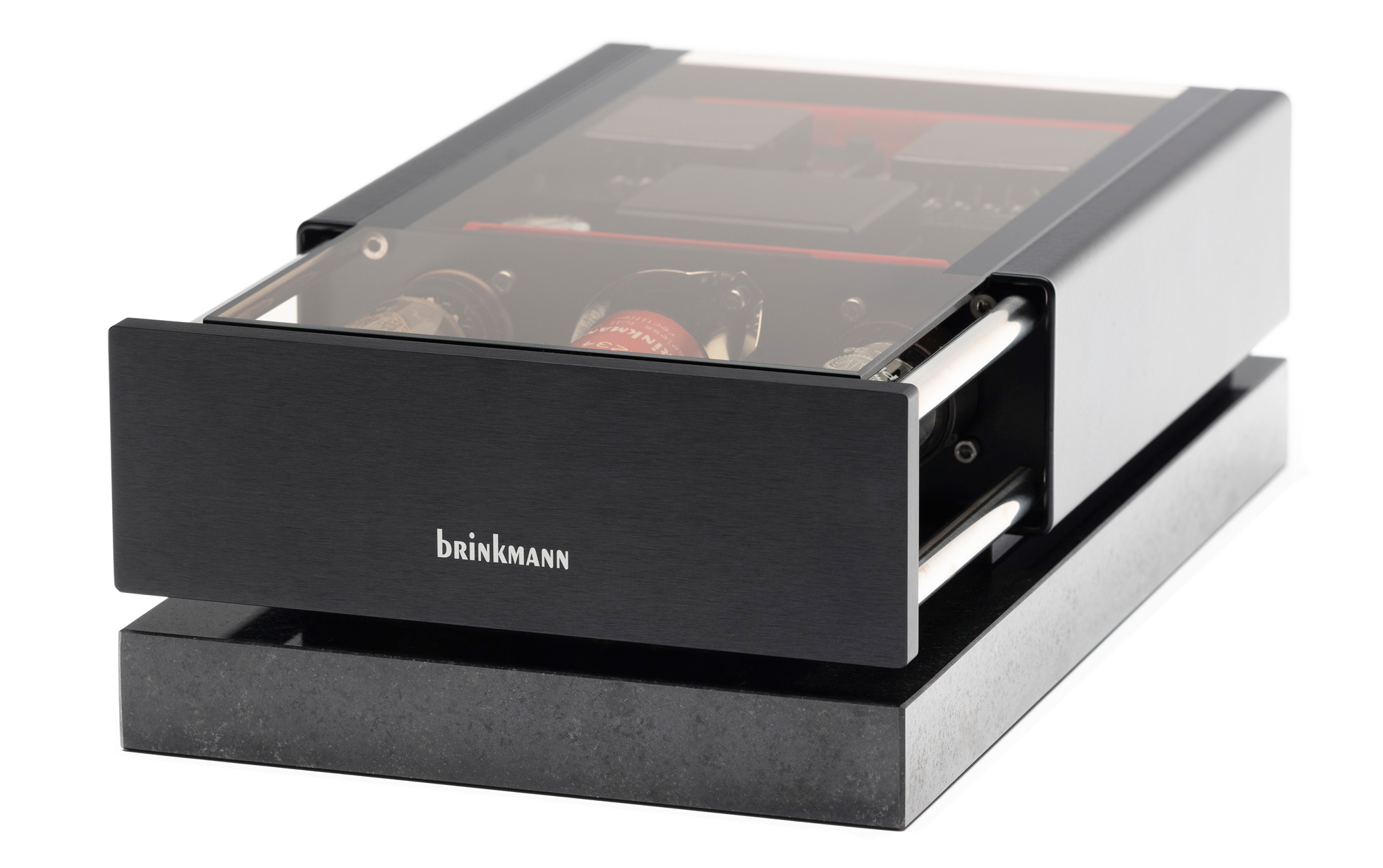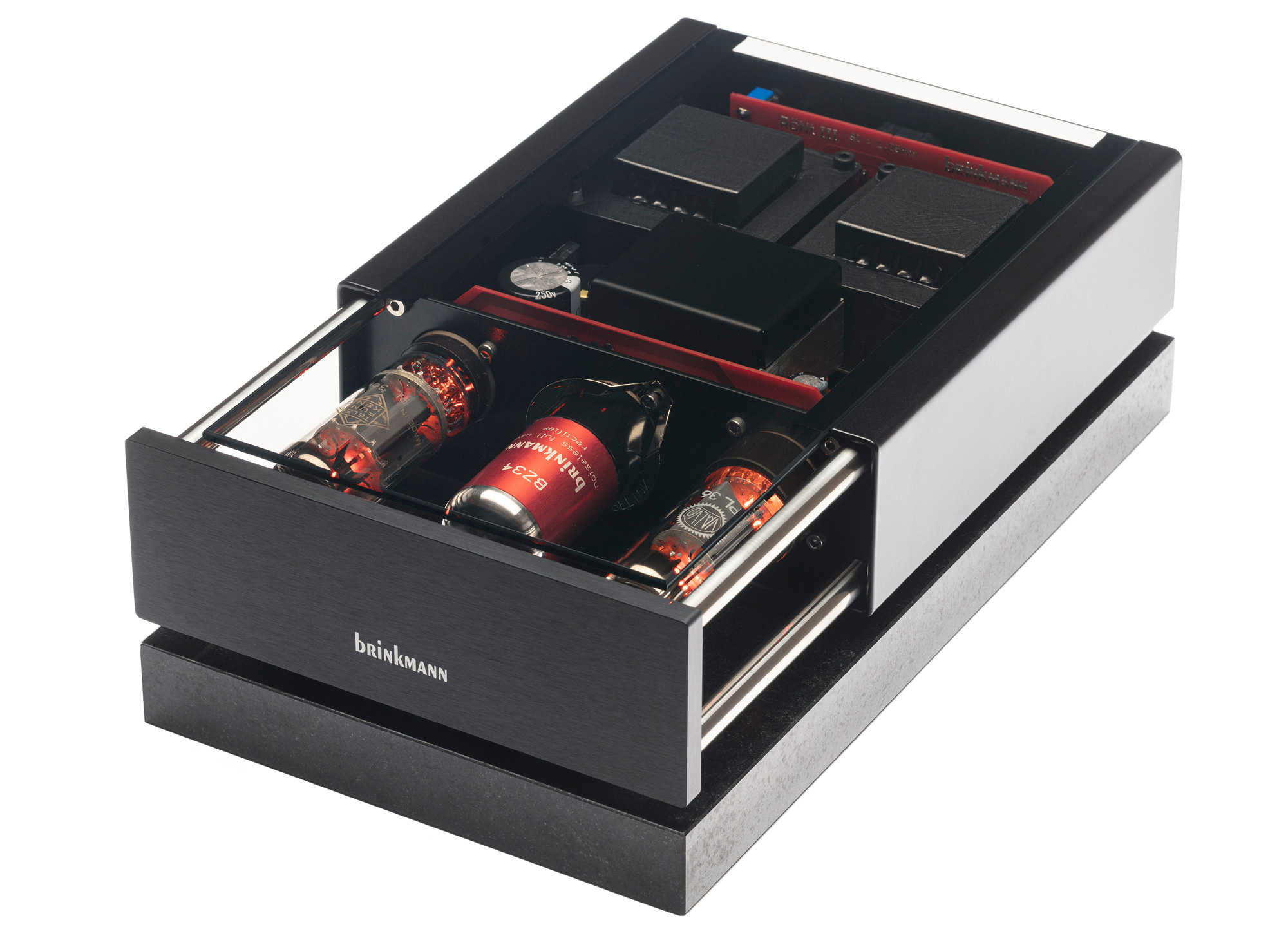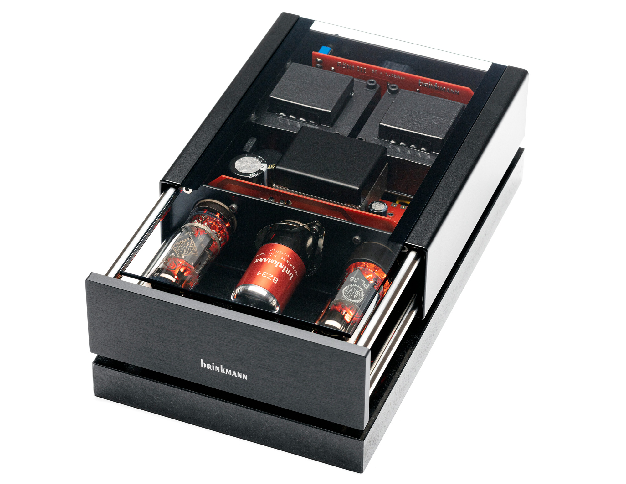 2007年、ブリンクマン ターンテーブル専用に社内で設計および製造された特別の実験機、「Sinus」ダイレクトドライブおよびベルトドライブモーターを発表しました。サイナスモーターは、以前のブリンクマンのターンテーブルで使用されていたパブスト製モーターよりも多くの電流を必要としたために、パワーサプライRöNtIIの開発が必要でした。 回路は、よりスムーズでより透明度の高いパフォーマンスを提供するシングルエンドのクラスAトポロジーに変更されましたRöNt IIは、2つの高電流、低抵抗の五極管(PL36)と1つの全波整流器(5AR4 / GZ34)を使用しました。
