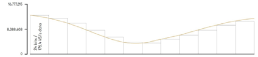 この図は、アナログの音波が24ビット176,400サンプル/秒PCMエンコーディングでどのように表現されるかを示しています。上記のCDオーディオよりも高いサンプルレートは、このグラフのX軸(横軸=時間)をより大きく表現することを可能にし、高いビット深度は、波の正確な振幅を各サンプル(Y軸)でより正確に表現することを可能にします。