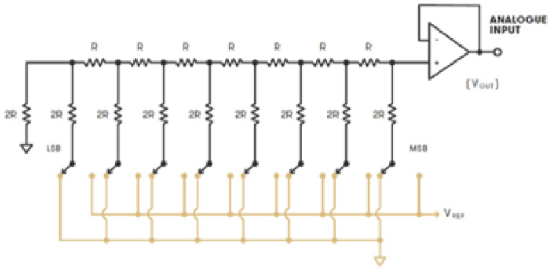 これらのコンポーネントの配置図を見ると、梯子(はしご)のように見えるので、このタイプのDACには「ラダー(梯子)DAC」という非公式な名前が付けられています。各電流源によって生成される電圧が、チェーンの下に行くほど段階的に小さくなるように、電流源間に抵抗を使用する必要があります。これらの抵抗の値とレイアウトから、ラダー型DACにふたつの顕著なタイプ、R-2R DACとバイナリウェイト(二進法加重)DACの名前が付けられました。