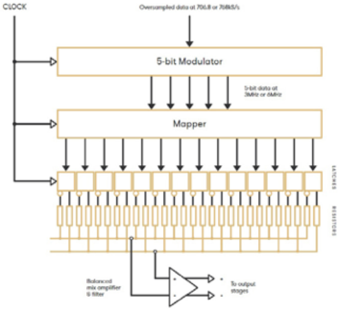 マッパーは5ビットで動作するため、リングDACに到着したPCMデータはまず706.8kHzまたは768kHzにオーバーサンプリングされます。その後、2.822MHzから6.144MHz(ユニット、設定、コンテンツのサンプル・レートによる)のレートで5ビットに変調されてからマッパーに供給され、マッパーはこの信号をDACの電流ソースに分配します。
