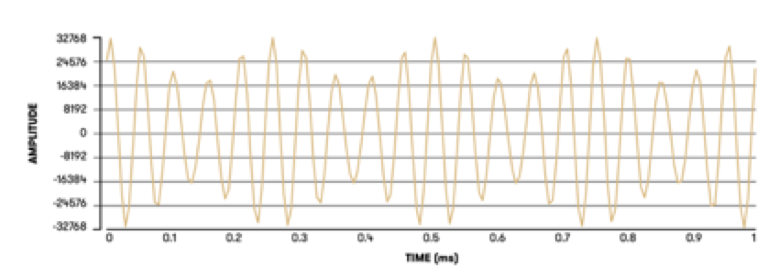 その結果、一部のDAC設計ではフィルターを完全に排除しています。しかし、このアプローチがもたらす課題は、D/A変換中に作られる人工的なナイキスト・イメージが、オーディオ・スペクトラムに依然として存在することです。これは、サンプルレートが低い場合(例えばCDオーディオなど)に現実的な問題となります。下の例では、20kHzの信号が24.1kHzのナイキストイメージで再構成されています。この2つの周波数は一緒に「ビート」し、下の画像のような波形を作ります。