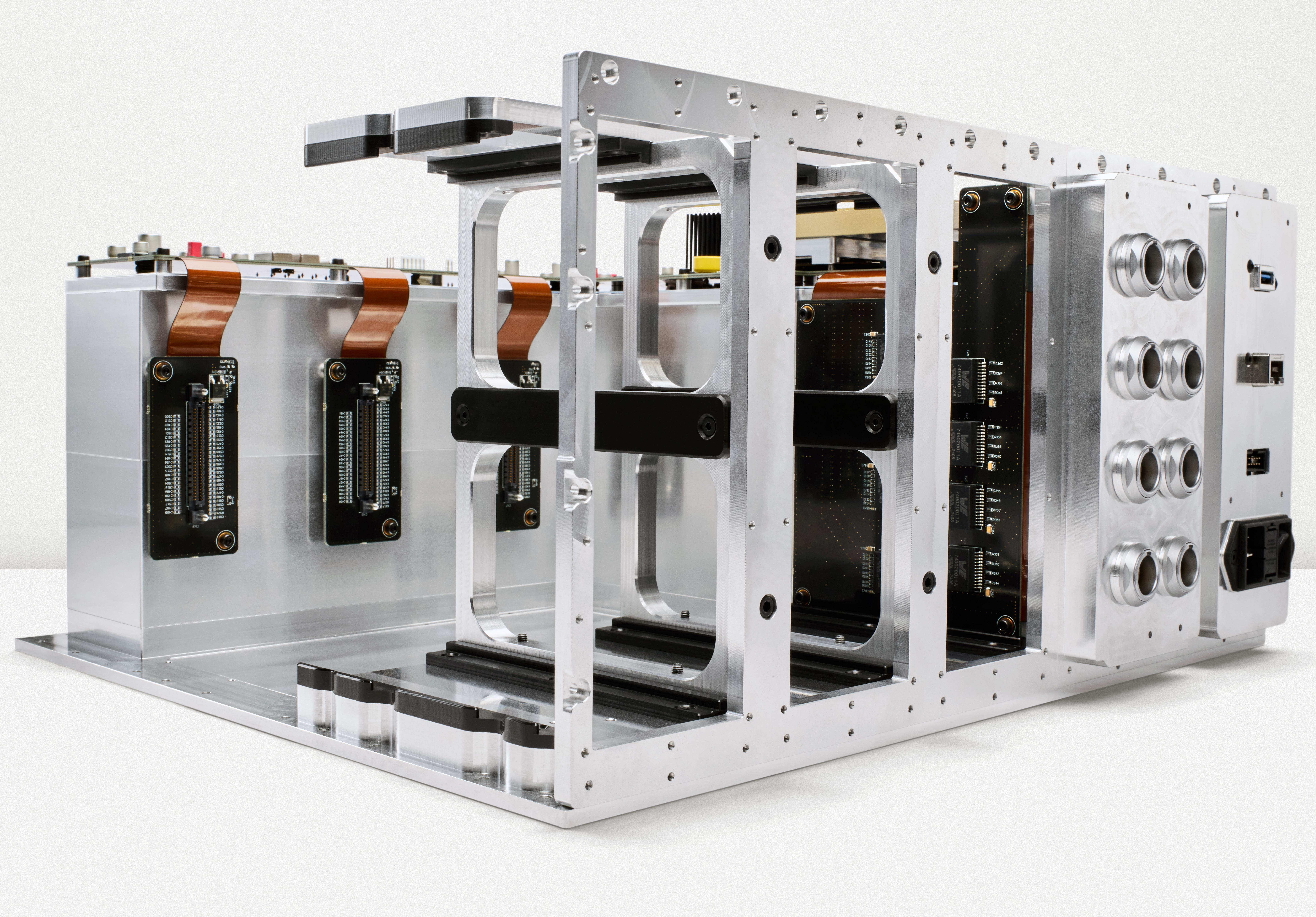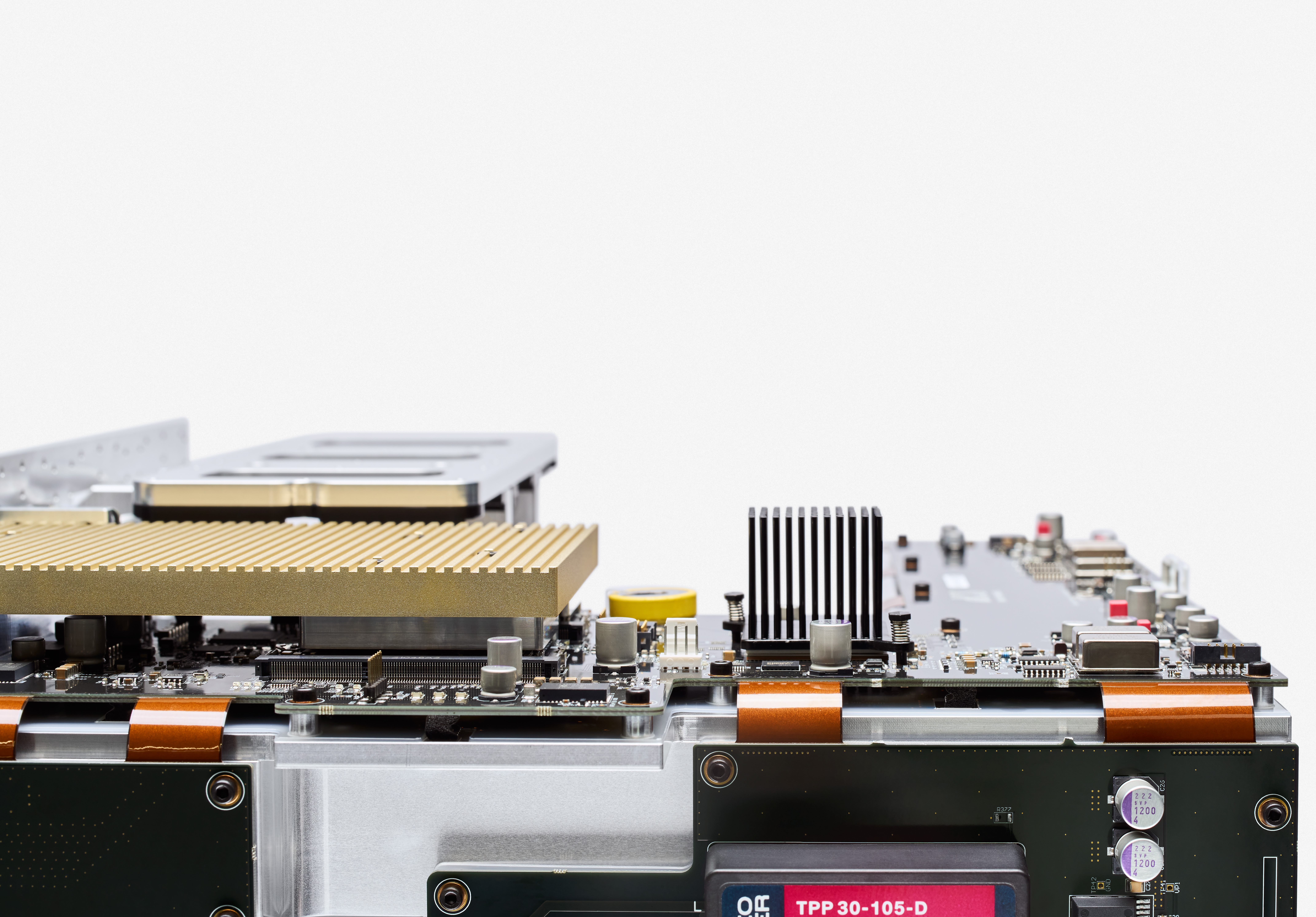 Vareseは、シャーシに収めるため、1枚の12層大型基板を”折り曲げて”一枚の基板としてシャーシに収めることに成功いたしました。基板からすべてのコネクターを排除し(とくにCoreでは複雑な折り方をしています)折り曲げる部分をフレキシブルな基板材料とし、デリケートな信号を処理する部分は堅固な材質を使用し、基板自体に2種類の材料を使っています。