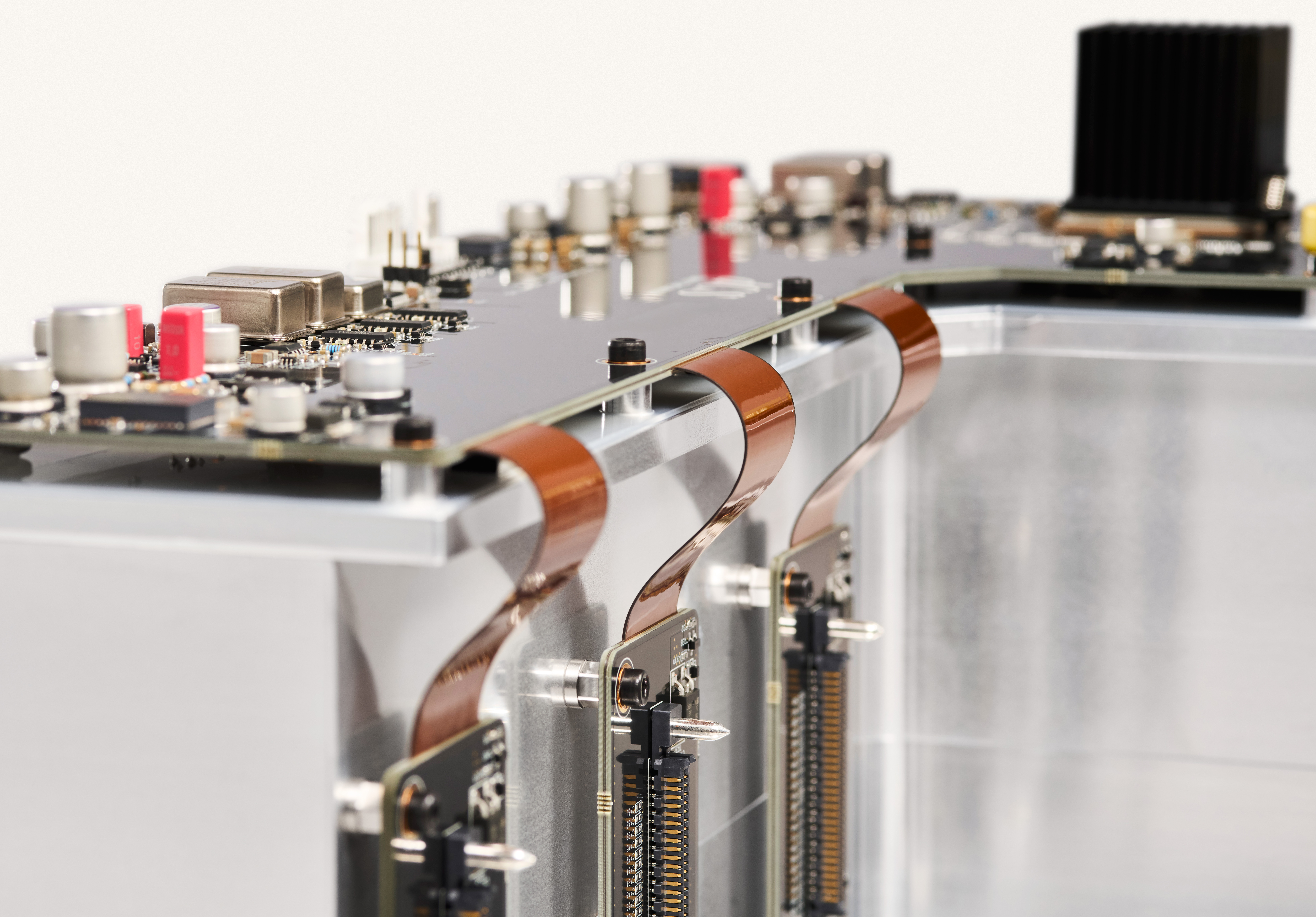 これによりリボンケーブルやコネクターなどの接点劣化による波形の乱れが大幅に減少し、理想的な伝送が可能になります。これは、世界初の技術で、dCSでは「フレックスリジッド」基板と呼んでいます。